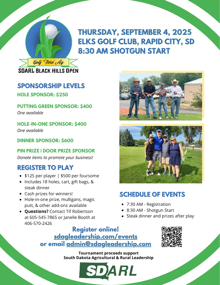 SDARL West River Golf Tournament Thursday, September 4, 2025 7:30 AM 1:30 PM Rapid City, SD (map) Google Calendar ICS SDARL’s fun and exciting West River Golf Tournament is Thursday, September 4, at the Elks Golf Course in Rapid City, SD. Play will start at 8:30am (Mountain) and conclude with lunch, awards, and door prizes.Registration is open for sponsors and players! Register Now!
